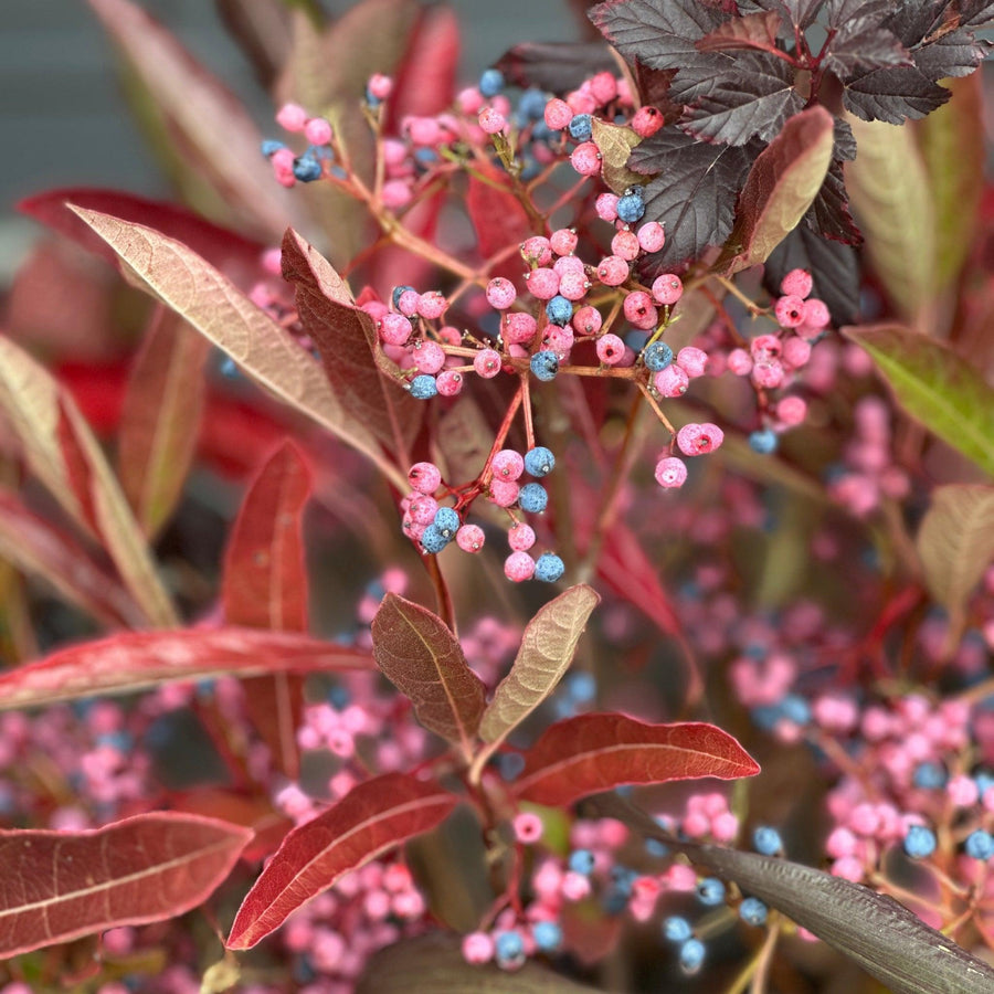 Experience the most beautiful berry display in the plant kingdom with this stunning Viburnum. It delivers loads of breathtaking berries that transform from green to shades of vivid pink and blue. A great companion pollinator for ‘Winterthur’ although Brandywine has good berry production even without another pollinator nearby. Showy glossy leaves change to incredible dark maroon-red in autumn. This plant thrives in half to full day sun and is a stunner alone or grouped to form an irresistibly colorful border planting.