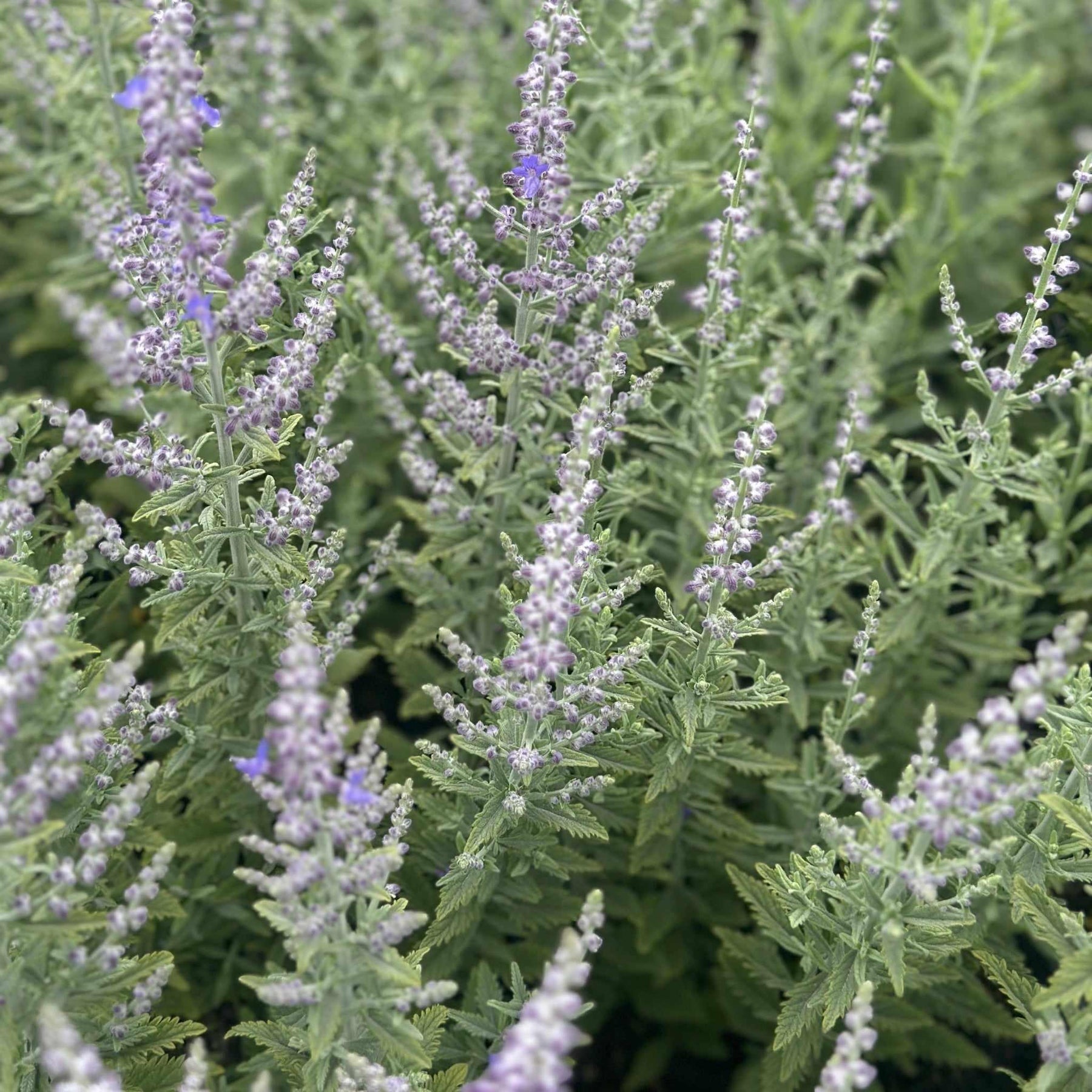 You would be wise to choose this Perovskia because it's the darkest purple shade to date. Rich lavender-purple flowers are produced on strong, upright plants filled with oval-shaped, notched leaves. This is early to bloom just like its counterpart 'Denim 'n Lace', starting around late July in Michigan. Compared to 'Denim 'n Lace', this is a slightly taller variety with darker purple calyxes and broader leaves, compared to the dissected leaves of the former.