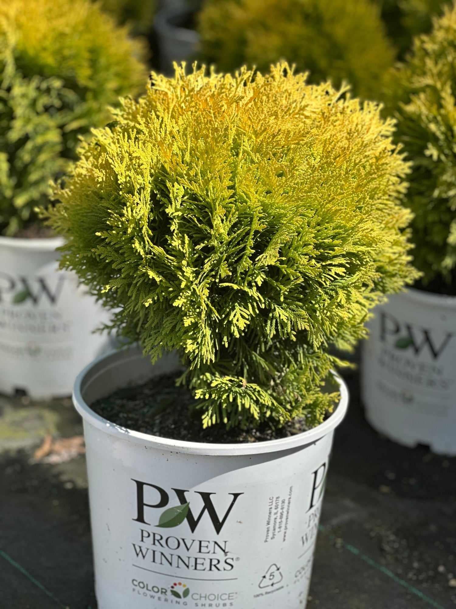 Dwarf evergreens look great year round, and fill a void in many landscapes. This bright golden evergreen ball features looser foliage than other dwarf gold colored seletions and a more block-like habit. Found at Van Vloten Nursery in Canada, it has good burn-resistance and holds its color nicely in winter and is very hardy. It thrives in partial to full sun and holds its winter color well.