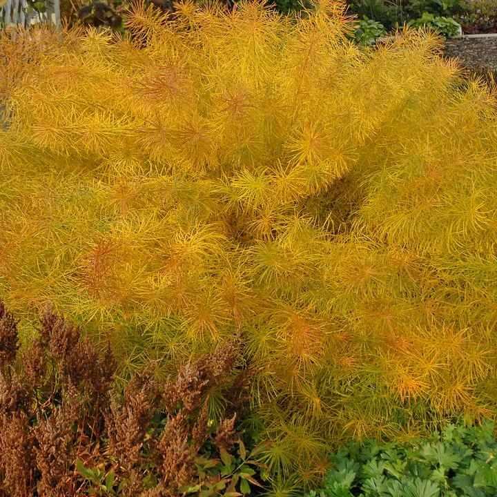 For optimal growth, plant in well-drained soil with full sun to partial shade exposure. Ensure consistent watering, especially during dry spells, but avoid waterlogging. Prune back after flowering to maintain a tidy appearance and promote bushier growth. In autumn, the foliage turns a striking golden color, adding seasonal interest. Fertilize sparingly in early spring to support healthy development.